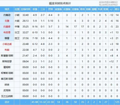 掘金队:约基奇23分17板17助、穆雷21分1板6助、小哈达威18分3板2助、戈登16分6板3助、约翰逊14分3板2助、布劳恩13分3板1助、布朗9分9板3助、斯特劳瑟7分1板1助