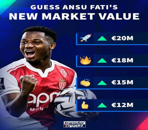 北京时间3月24日,德转预热了巴塞罗那外租摩纳哥的锋线球星安苏-法蒂的身价更新,他们给出了四个全部为上涨的选项,最高涨至2000万欧元。